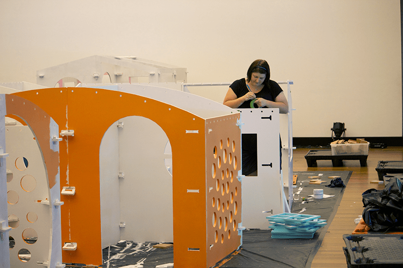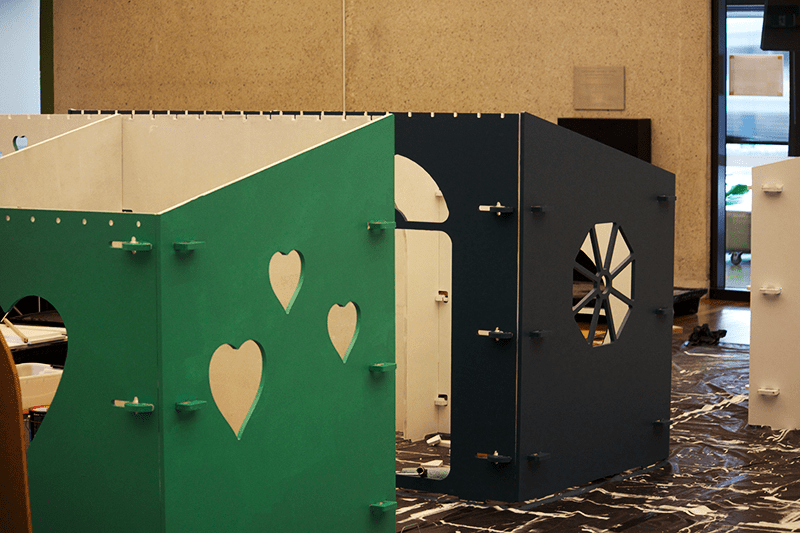 Through a series of workshops, our facilitators worked with the parents to develop, design and prototype the cubby houses, with the final two days concluding last week as the houses were constructed and painted. Each cubby house was designed in modules with self-supporting walls and uses no glue, no nails and no screws! The entire house clicks, drops and slides together using the design of just three joints. With a set-up and pack down time of around 15 minutes, these small spaces are intelligently designed and fit together like building blocks.